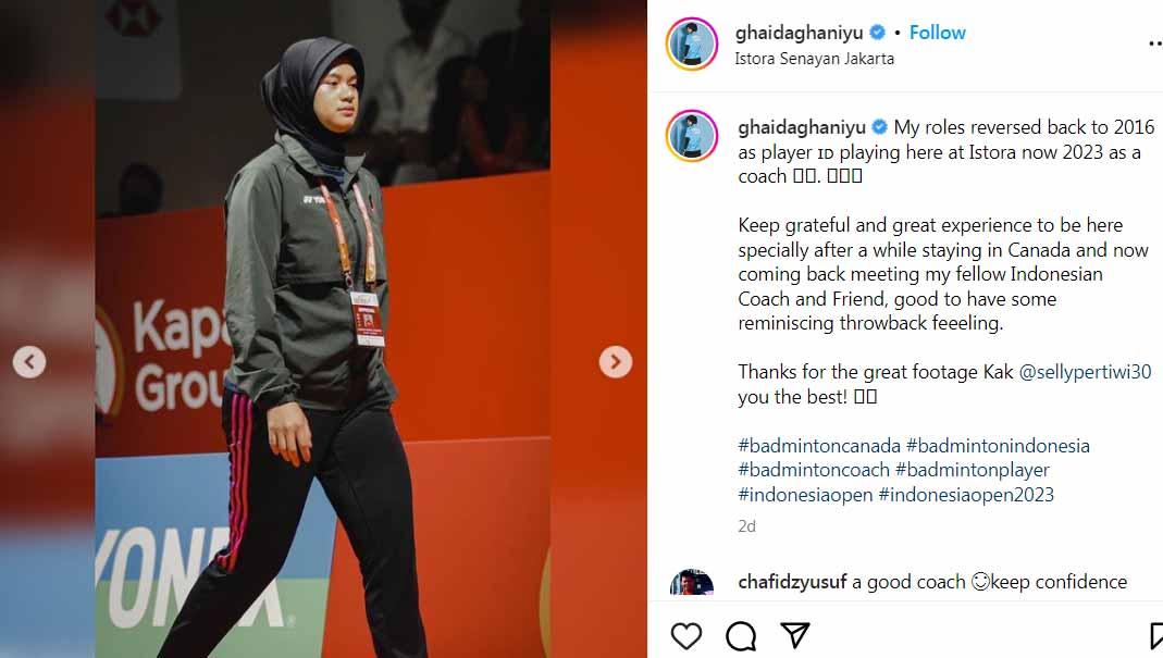 Bahkan teranyar, Ghaida Nurul Ghaniyu menemani pebulutangkis asal Kanada, Catherine Choi, saat tampil di perhelatan akbar Indonesia Open 2023. Ajang berlangsung di Istora Senayan, Jakarta.