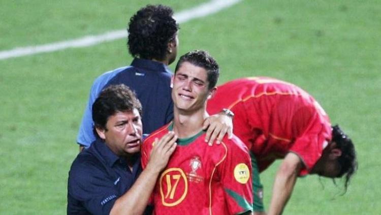 Tangisan pertama Ronaldo pecah terjadi dalam pertandingan final Piala Eropa 2004. Kala itu Ronaldo bermain dalam laga Portugal vs Yunani di Stadoin da Luz, Lisbon dan dipimpin oleh wasit Markus Merk.