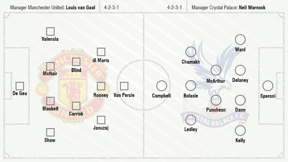 Man United (4-2-3-1): de Gea; Valencia, McNair, Blackett, Shaw; Blind, Carrick; di María, Rooney, Januzaj; Van Persie.